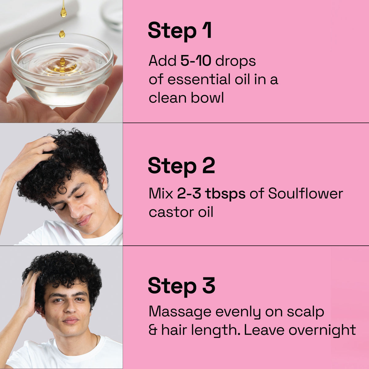 - Take 5 drops of pure Rosemary Essential Oil and mix it with 1-2 tbsps. of Soulflower Castor/ Olive oil, massage your whole scalp and keep it to rest for at least 4 hrs. or overnight for the best results. If you have dandruff use it with Soulflower Tea Tree Anti-Dandruff Scalp Oil.