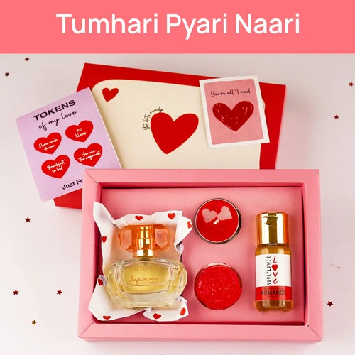 - This Women's Day Gift Set includes: Relaxing Body Massage Oil: Help her unwind and de-stress with this luxurious massage oil, leaving her skin feeling soft and rejuvenated. Strong & Lasting Mysterious Eau De Parfum: A fragrance to boost her confidence and celebrate her unique self. Calming T-Light Candles: Create a peaceful ambiance for self-care and reflection with these soothing candles. Gentle Soap: A fragrant and luxurious soap to cleanse and nourish her skin, leaving it feeling refreshed and revitalized.